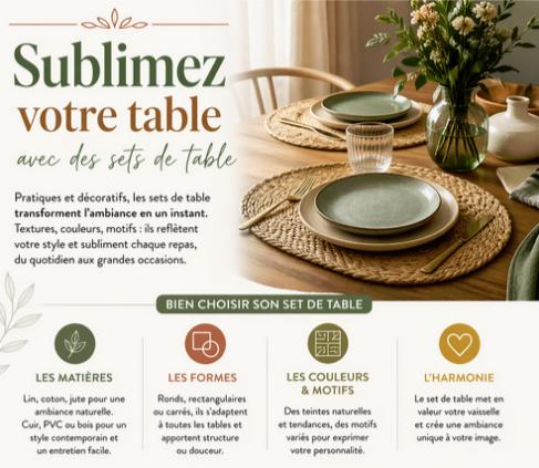Pour découvrir différents styles et trouver facilement votre inspiration, vous pouvez explorer une sélection de sets de table adaptés à tous les univers déco.